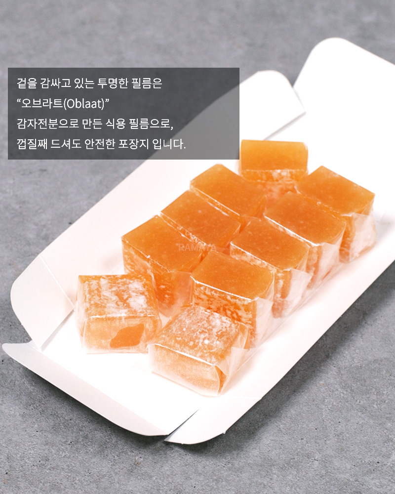 겉모습은 사각 젤리 형태로 쫀득하고 부드러운 식감이 특징이에요.
