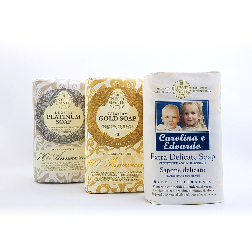 보습효과가 좋은 이탈리아 명품 수제비누 네스티단테 골드, 플레티넘 백금, 베이비솝 250g 골드와 실버는 60,70주년 기념비누, 베이비솝은 어린아이용 비누입니다.