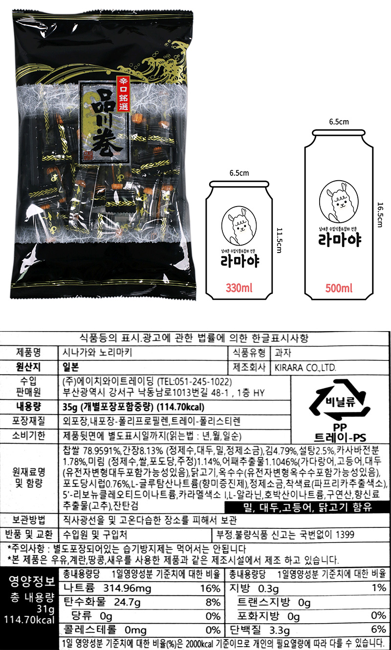 키라라 시나가와 노리마키 35g 일본 김말이 쌀과자 센베이 술안주 간식 : 라마야